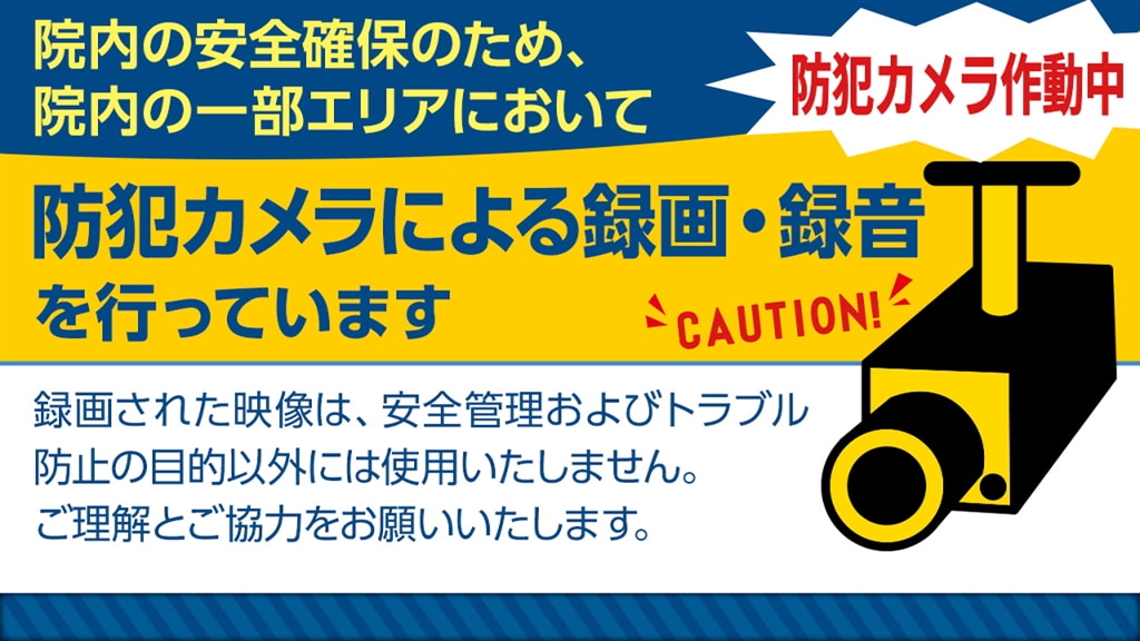 当院では院内の一部エリアにおいて防犯カメラによる録画・録音を行っております。